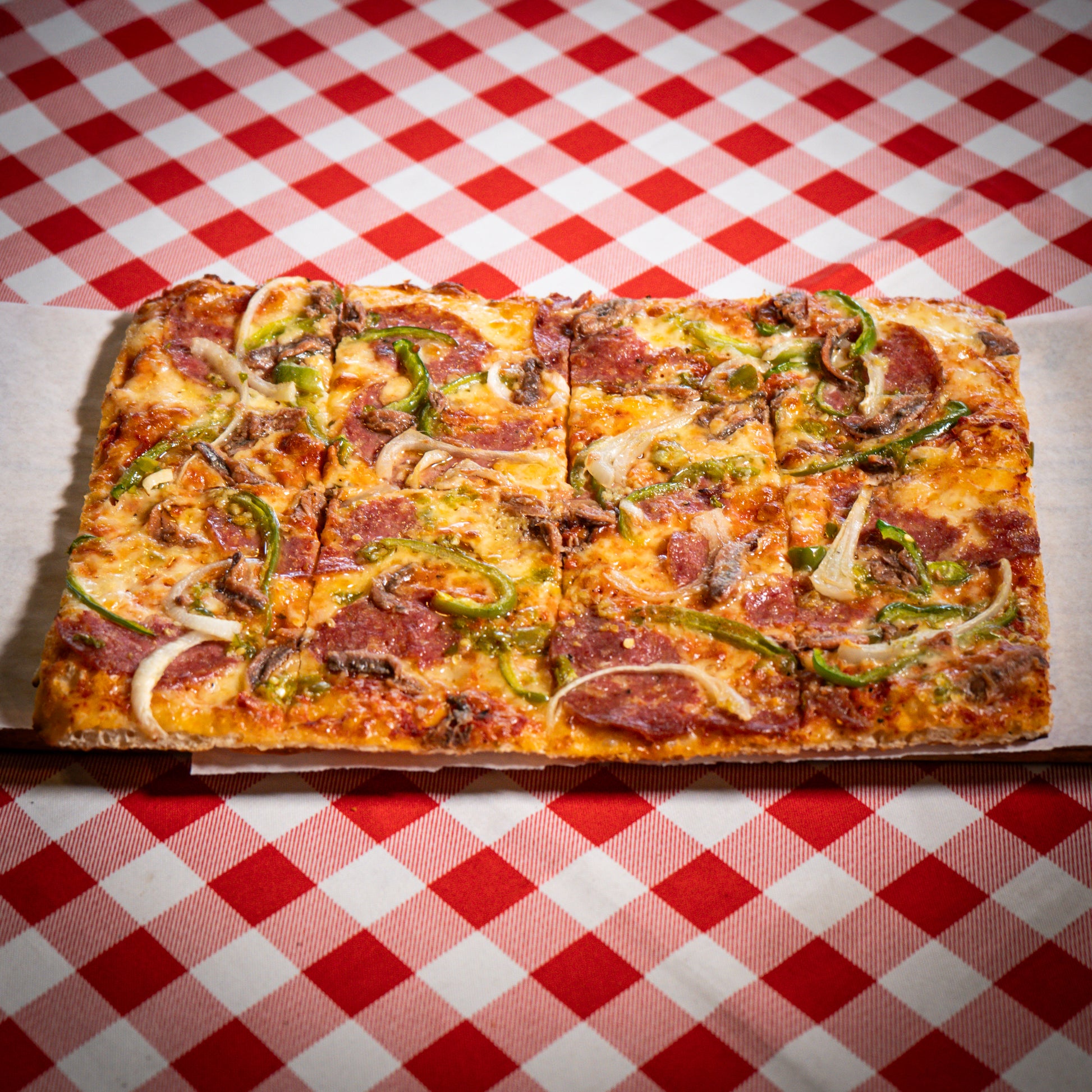 Made with fresh ingredients: mozzarella, tomato, salami, onions, anchovies, green peppers, garlic, and chilli