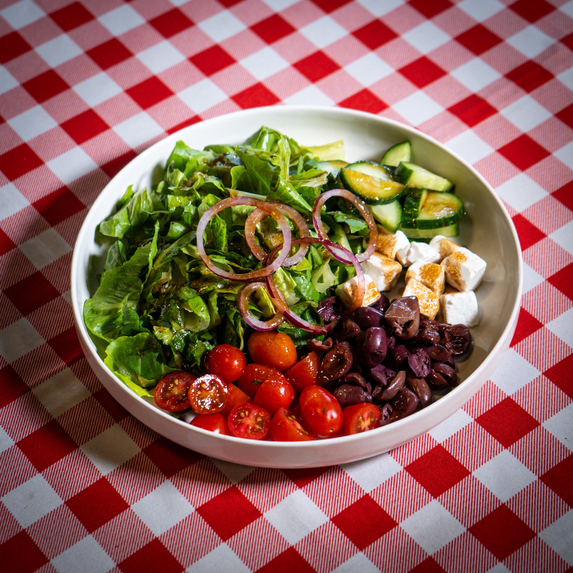 Made with fresh ingredients: cos lettuce, cucumber, kalamata olives, cherry tomatoes, red onion, and feta