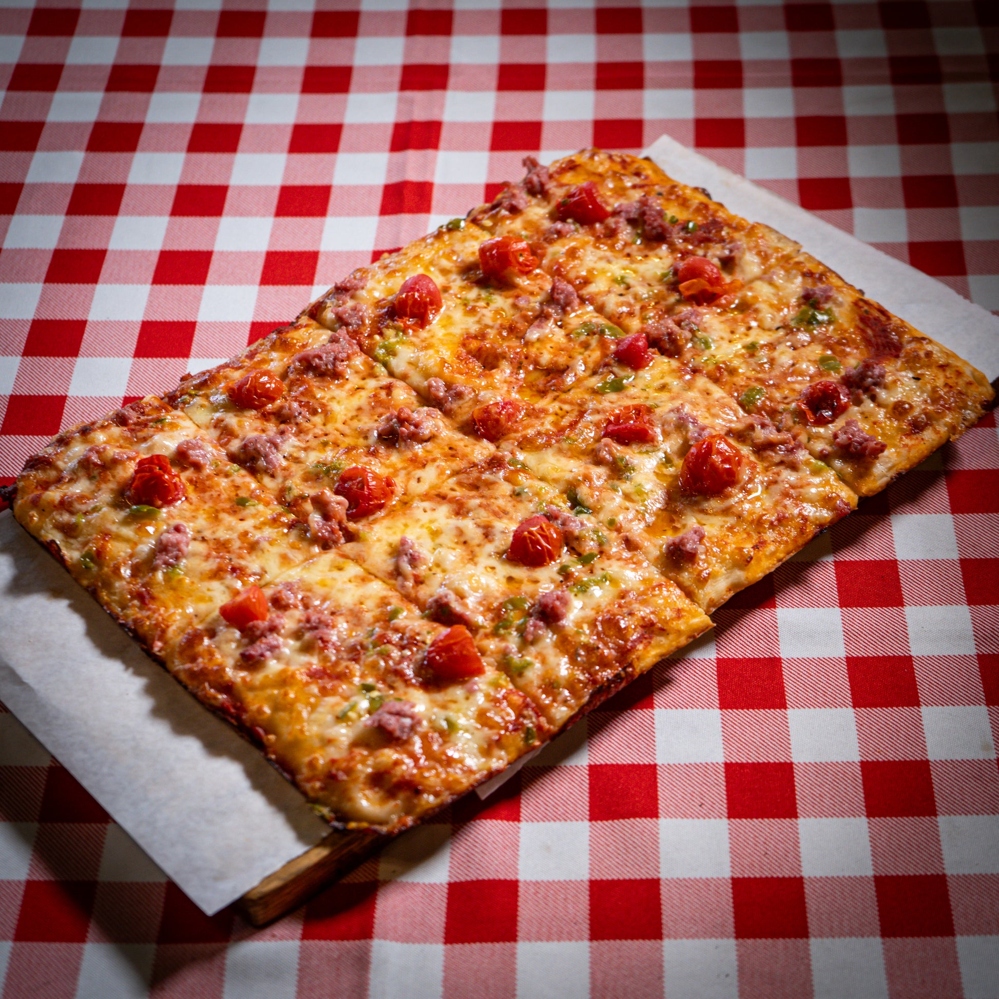 Made with fresh ingredients: mozzarella, tomato, salsiccia, cherry tomato, and chili