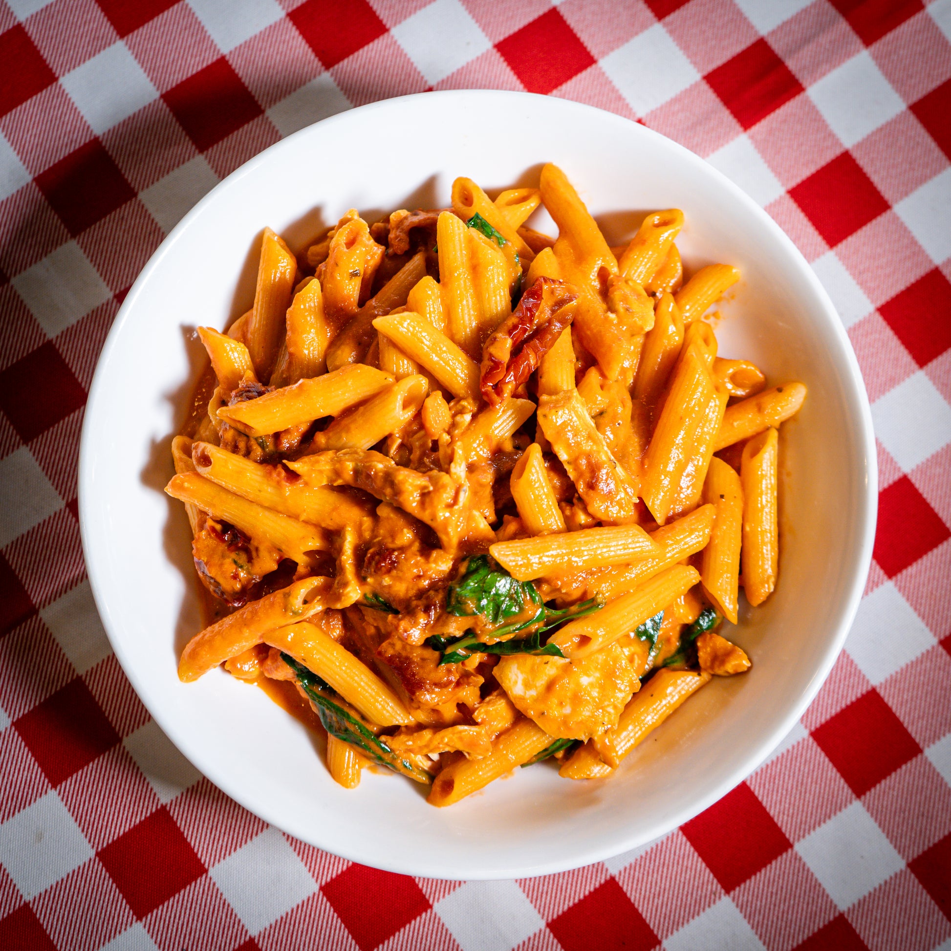 Made with fresh ingredients: chicken, sundried tomatoes, cream, and pomodoro