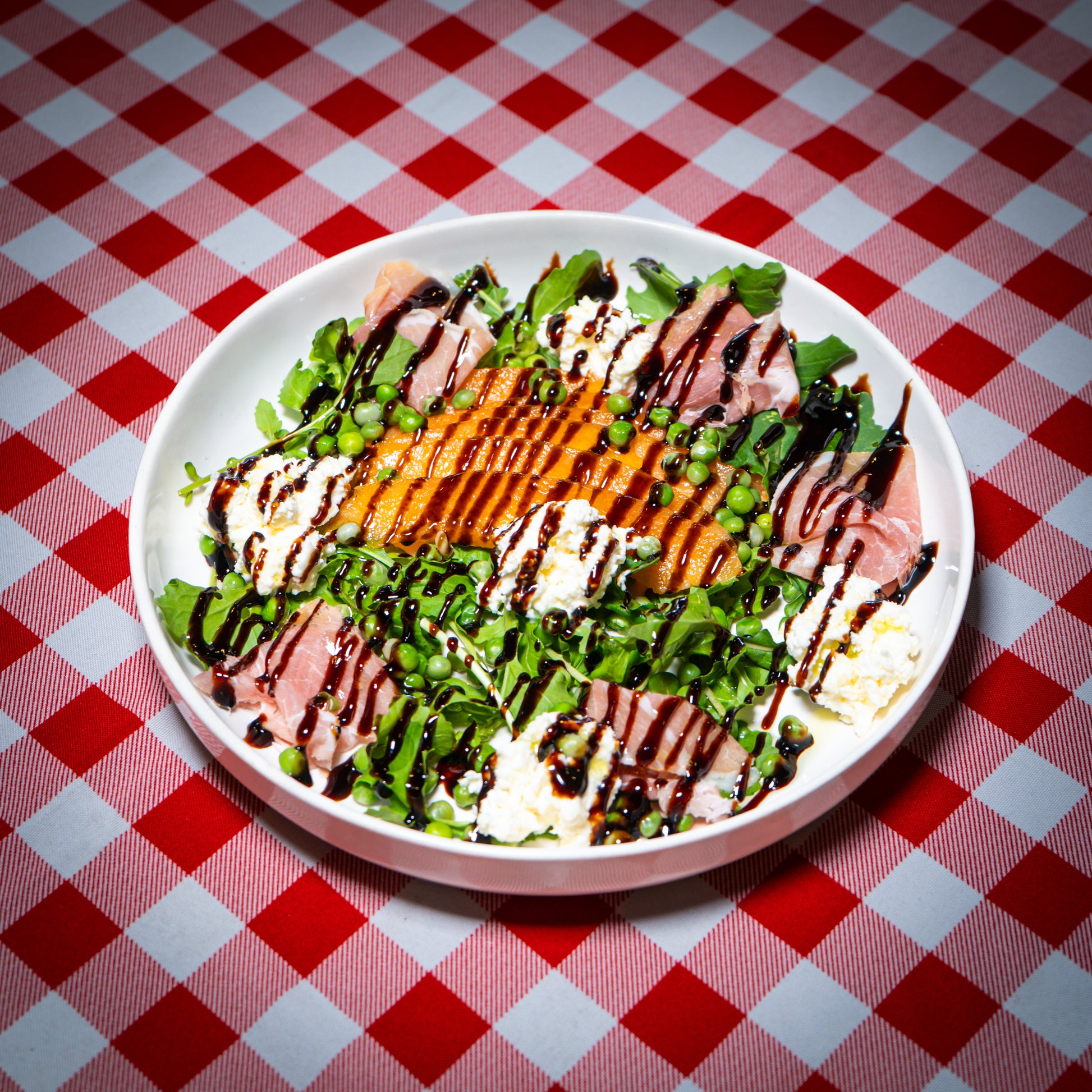 Made with fresh ingredients: Parma ham, sweet melon, rocket, fior di latte cream, spring onion, peas, and balsamic glaze