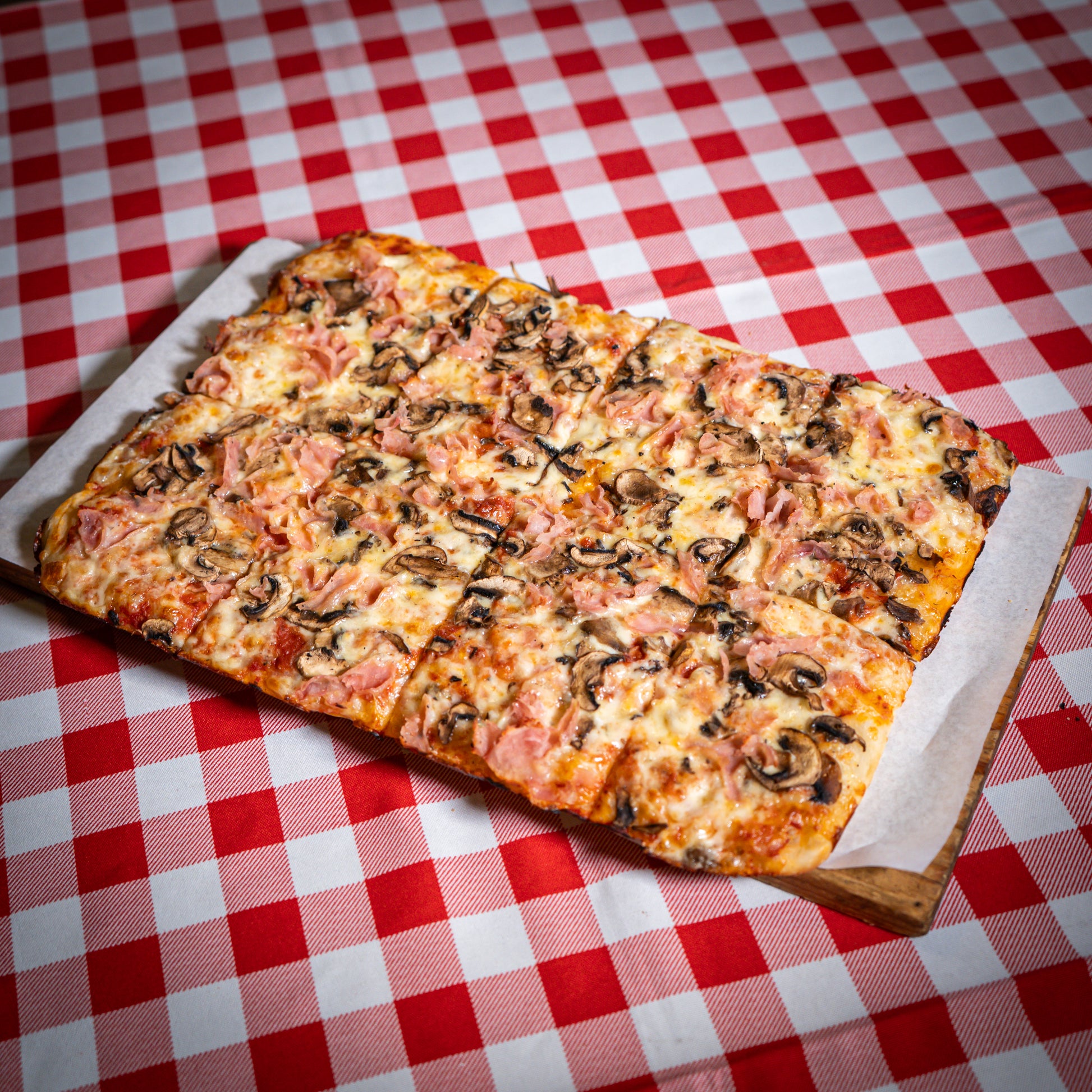 Made with fresh ingredients: mozzarella, tomato, ham, and mushrooms