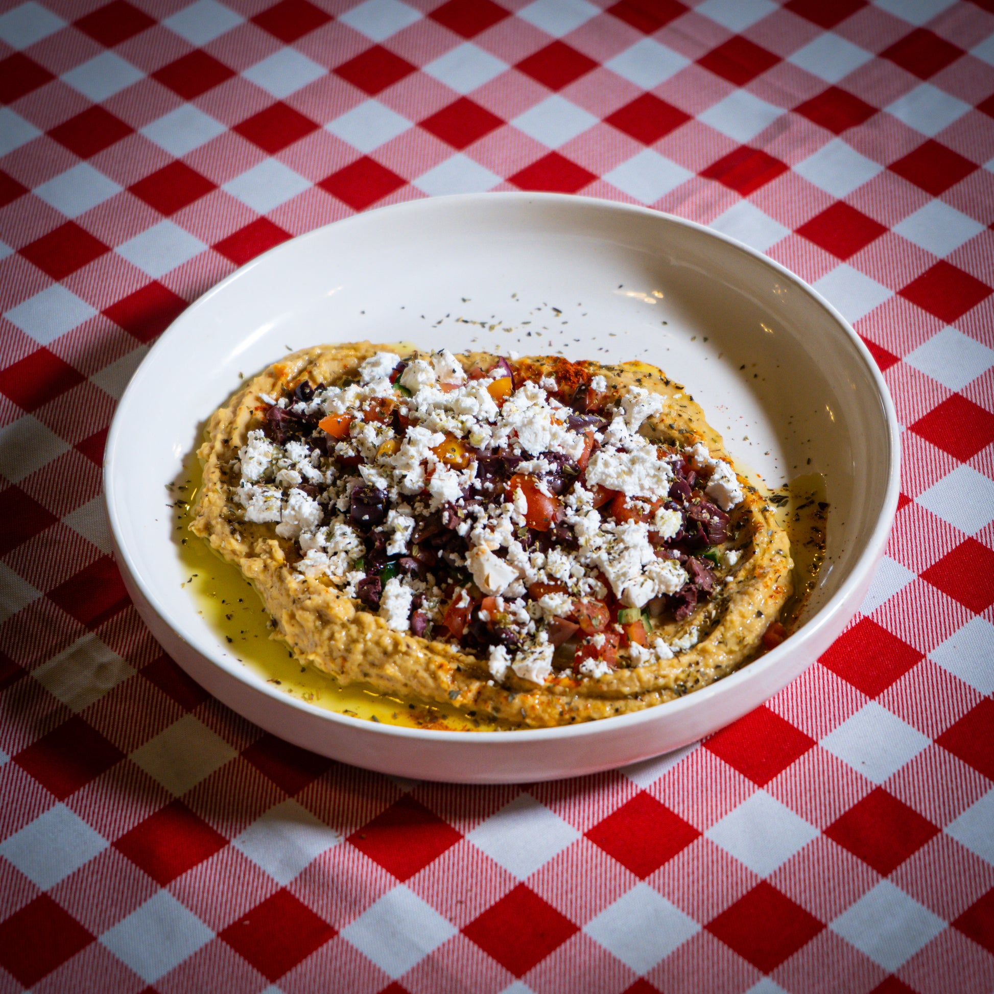 Made with fresh ingredients: cucumber, kalamata olives, cherry tomatoes, red onion, crumbled feta, origanum, and humus