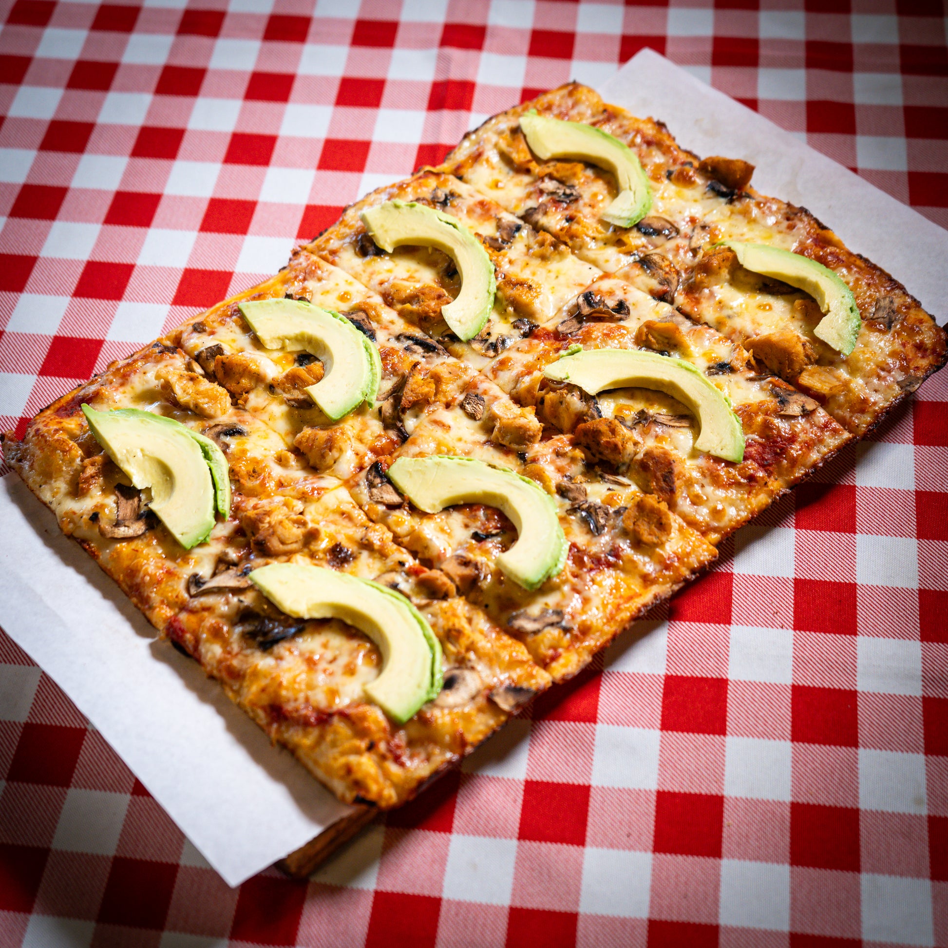 Made with fresh ingredients: mozzarella, tomato, chicken, mushrooms, and avocado